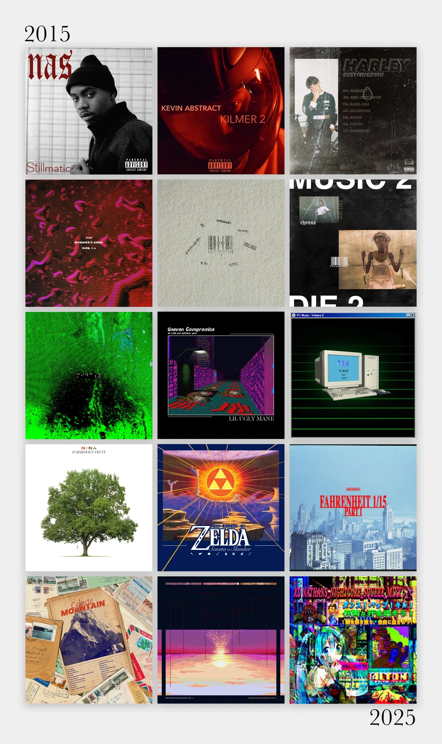 I never quite gave up making album covers. To the left you can see a sampling of the 100+ covers i’ve designed over the years. They help plot my journey, and how my stylistic focus has oscillated over time.